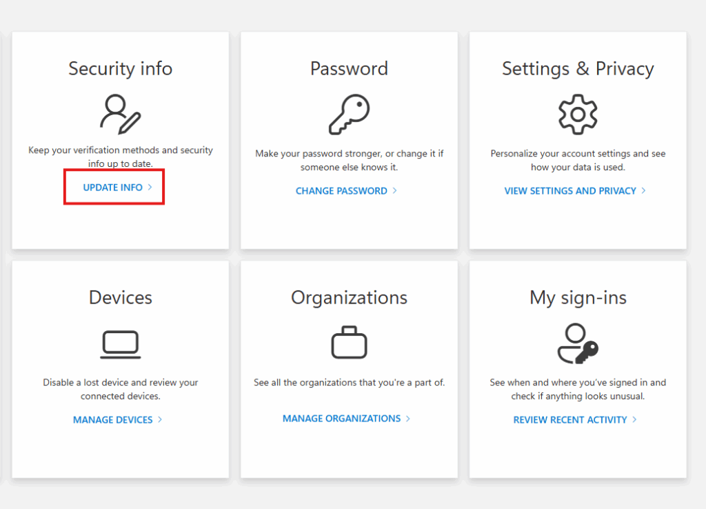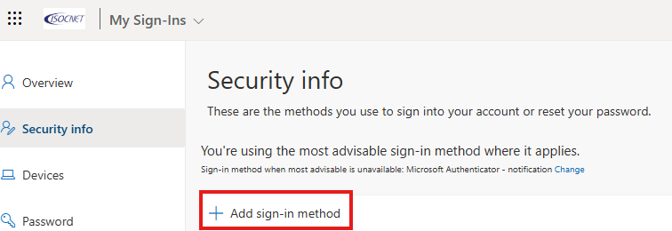 2. Select Security info from the left pane or from the link in the Security info block, and then select “Add sign-in method”, from the Security info page.