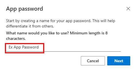 4. Type the name of the app that requires the app password, and then select Next.