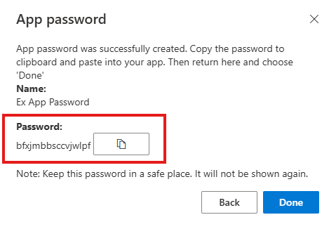 5. Copy the text from the Password box, paste the password in the password area of the app and then select Done.