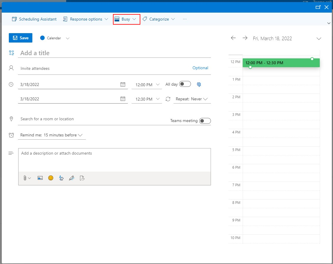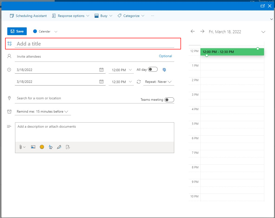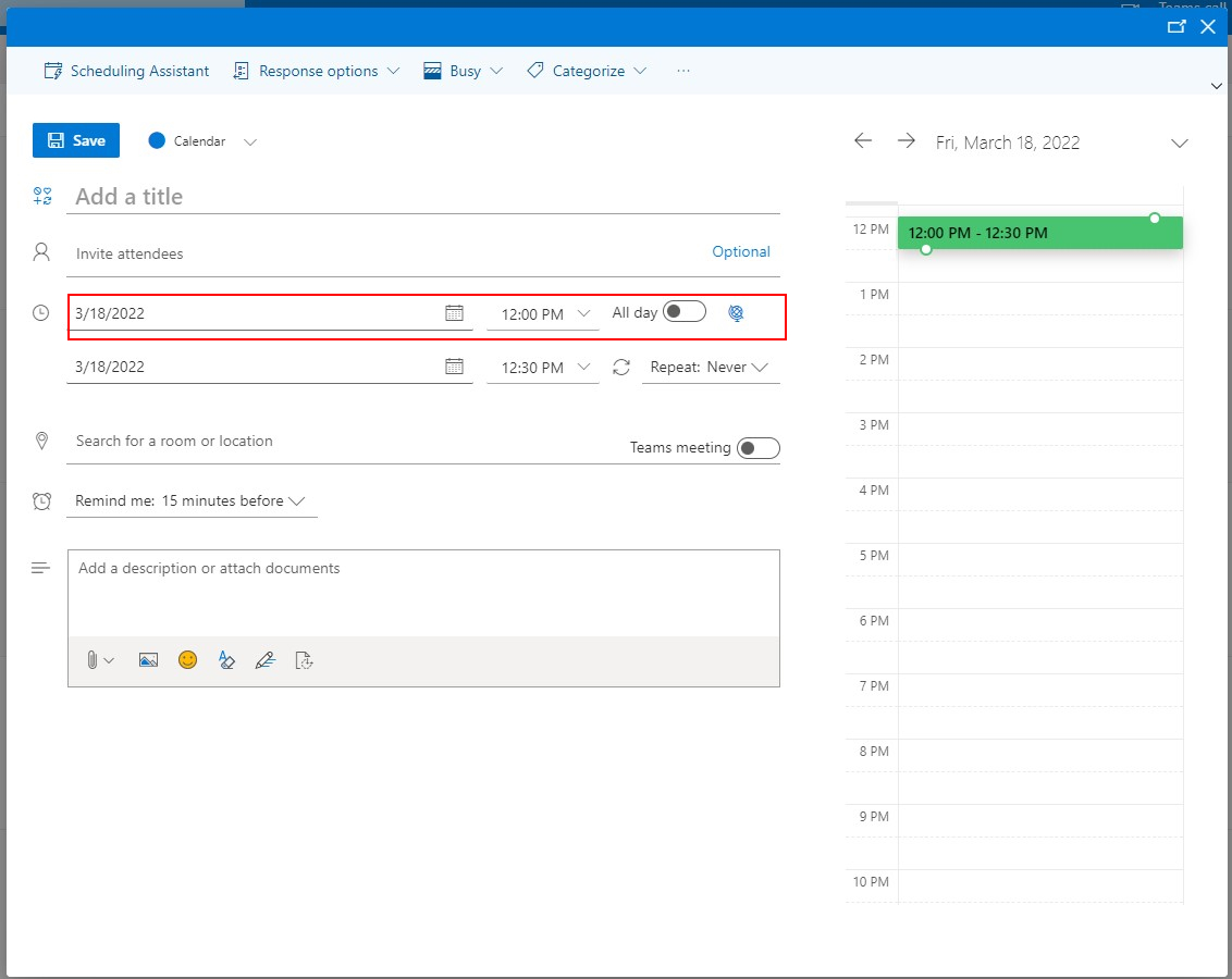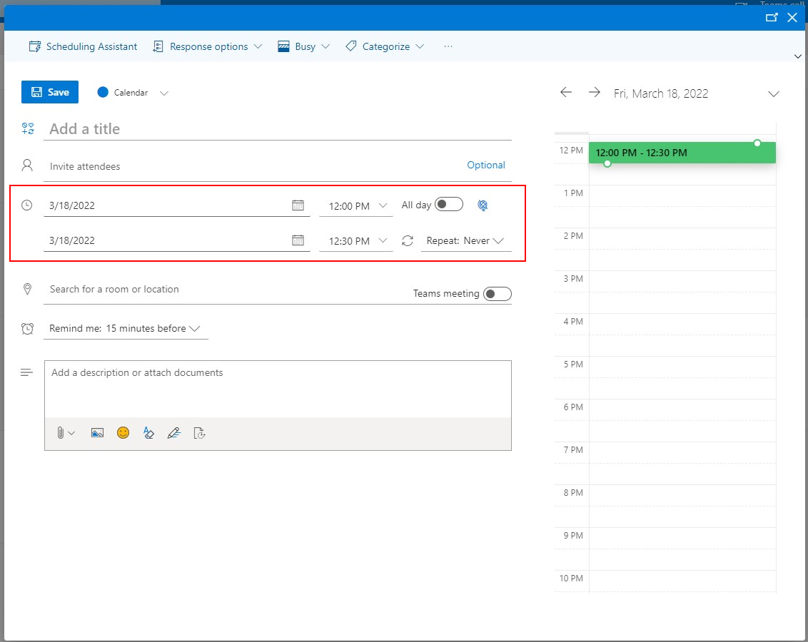 -You can also change the time of the meeting at the top of the pop up and whether it is all day or not.