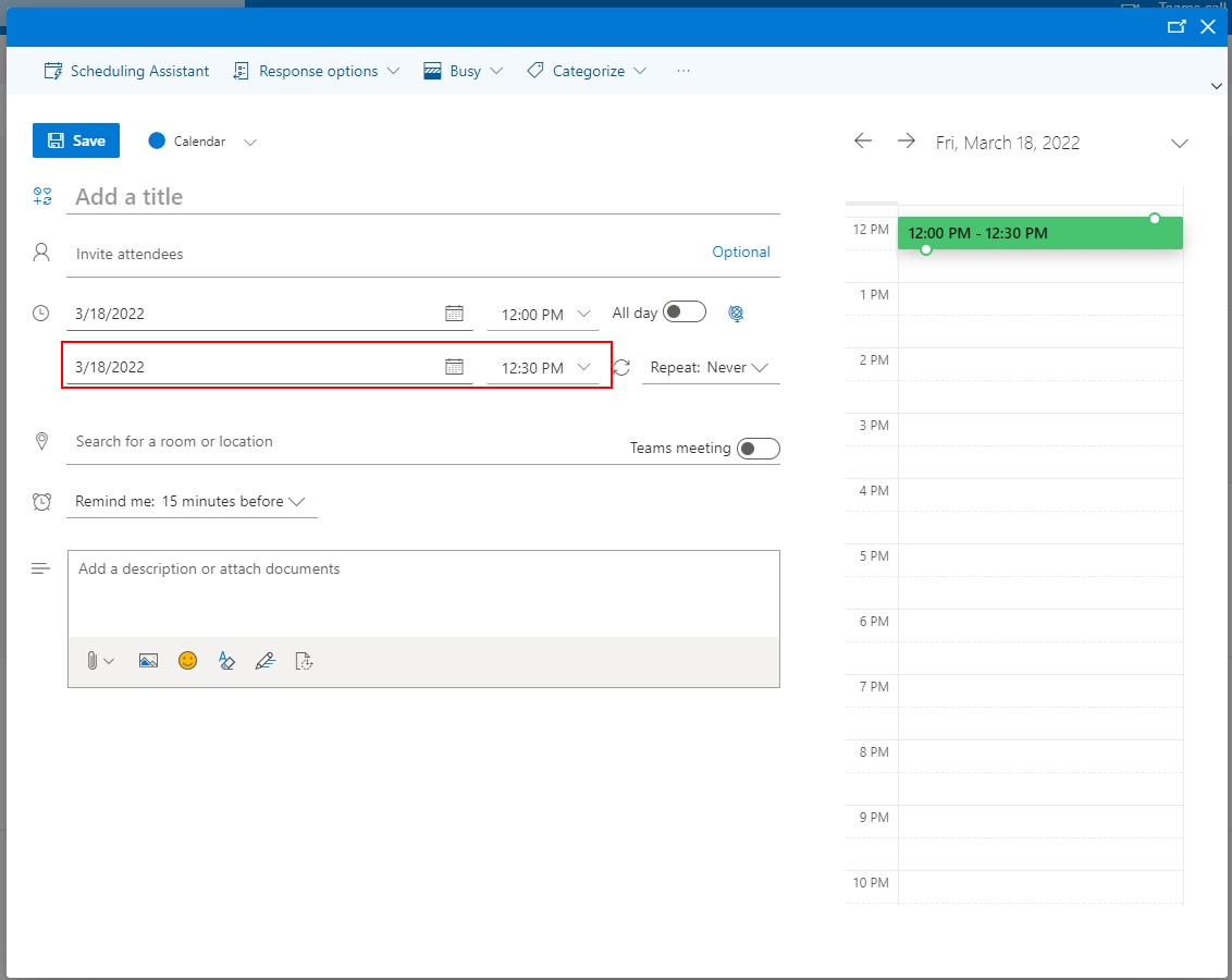 -If the meeting will not be all day, you can select the date/time that it will end.