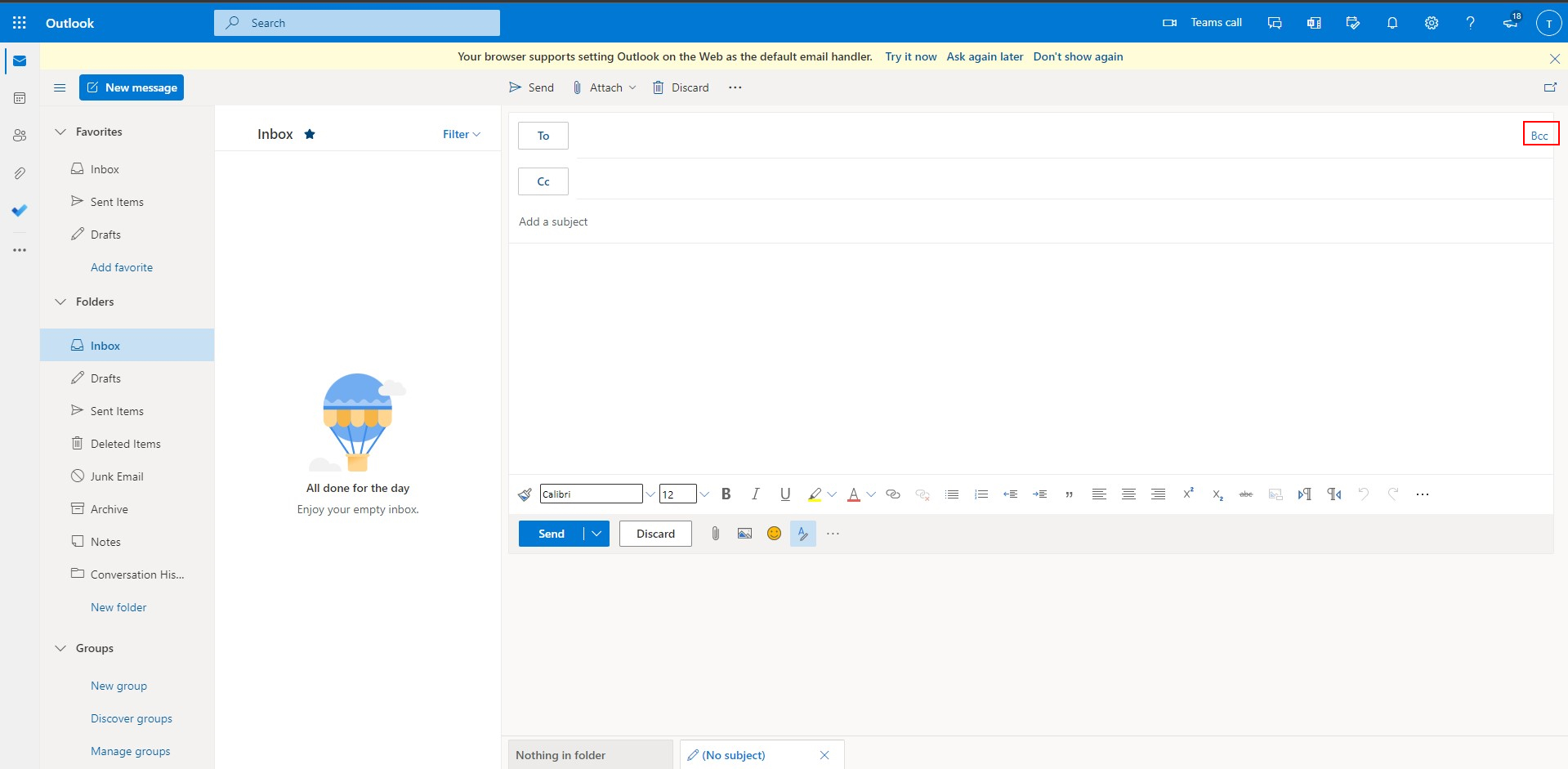 -Bcc or blind carbon copy is used when you want to add someone to the email, but don’t want other people to see them. When you first open your inbox, this field will be hidden, you will need to hit the Bcc button in the upper right hand side.