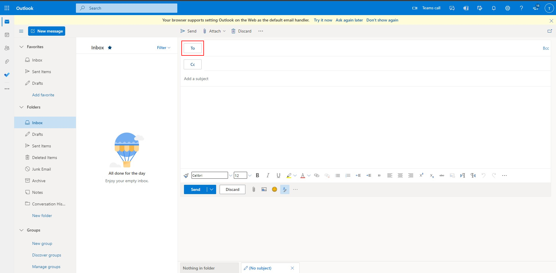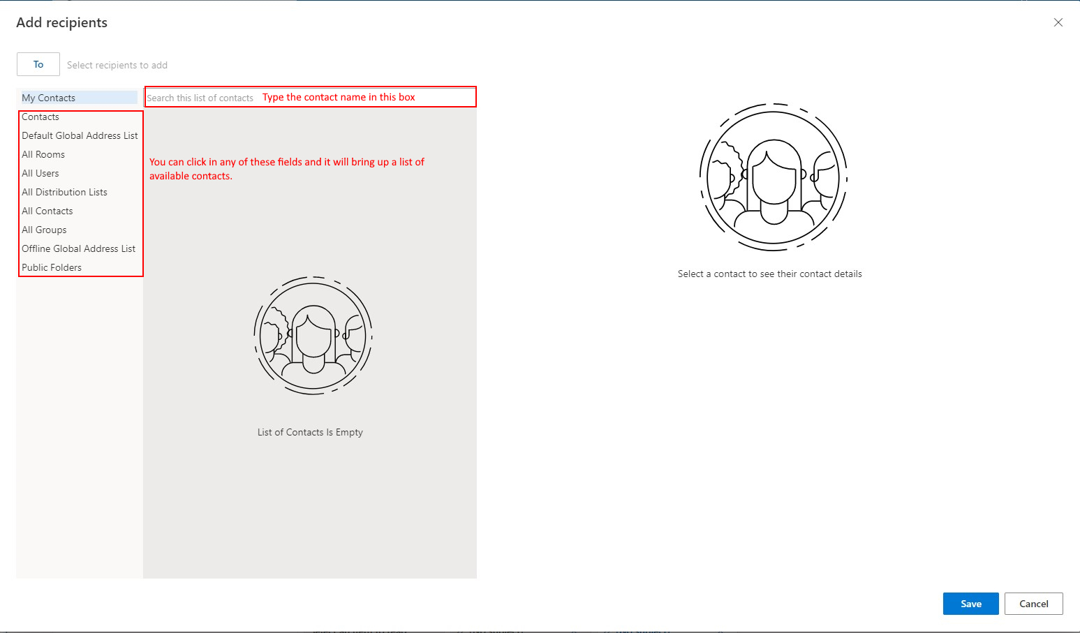 4. When you click on the “To” button it will open the below pop-up. Where it will show the contacts that you have saved to your Outlook Web application.