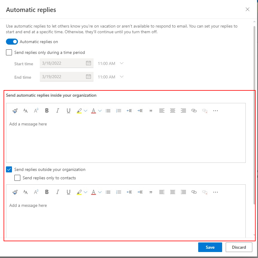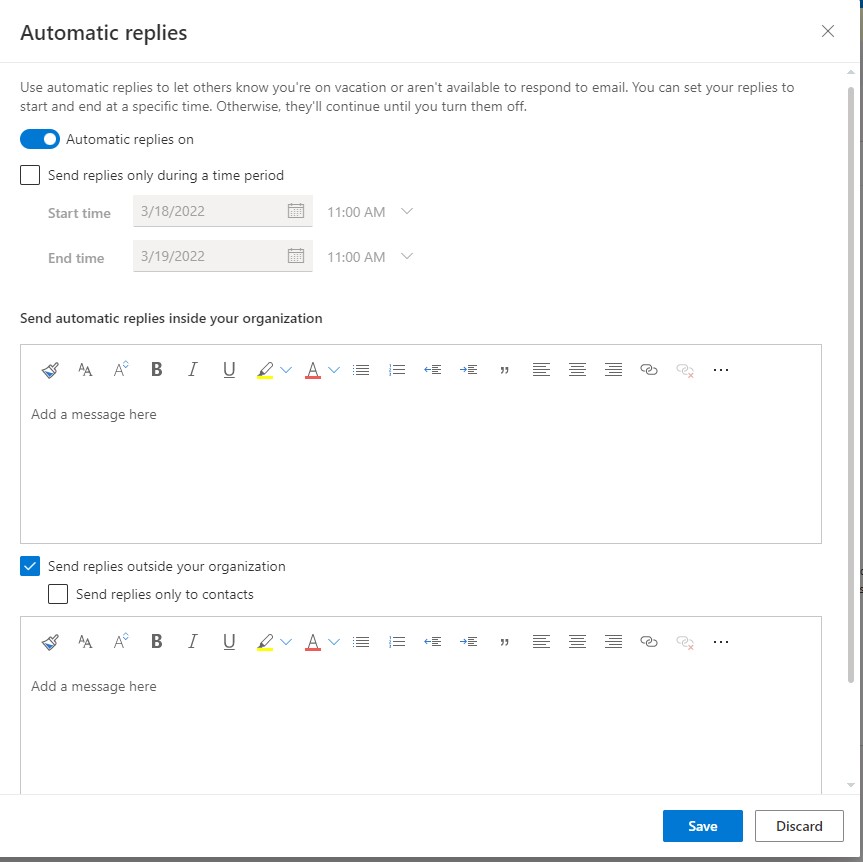 -This will allow you to select the start time and end time of your automatic replies.