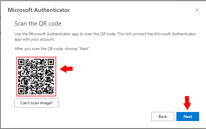 13. Next, the pop-up window will have the QR code you can scan from the Microsoft Authenticator app to add your account. You will now see your account added on the home page of the Microsoft Authenticator app. Click Next.