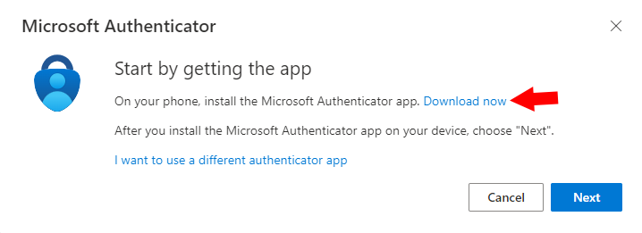 10. When you click Next you will receive a pop-up window. If you do not have the Microsoft Authenticator app already downloaded onto your phone, click the blue link the reads Download now.