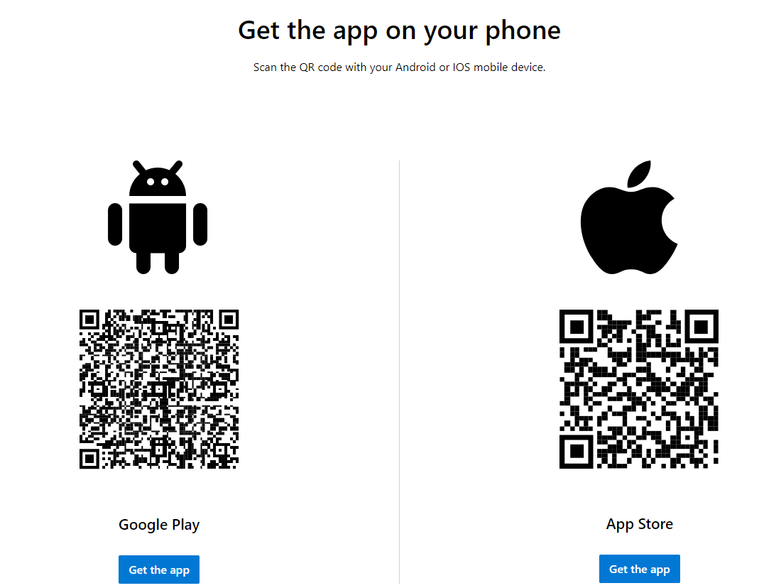 11. Once you click Download now, a new tab will open. Scroll down and you will see two QR codes on the screen. One is for the Google Play store, the other for the Apple App store. Open your phone’s camera and hover over the QR code that matches your phones app store, then click the link that you will see on your phones screen. This link will take you directly to the Microsoft Authenticator app in your phone’s app store, allowing you to easily download it. If you already have the Microsoft Authenticator app on your phone, skip this step.